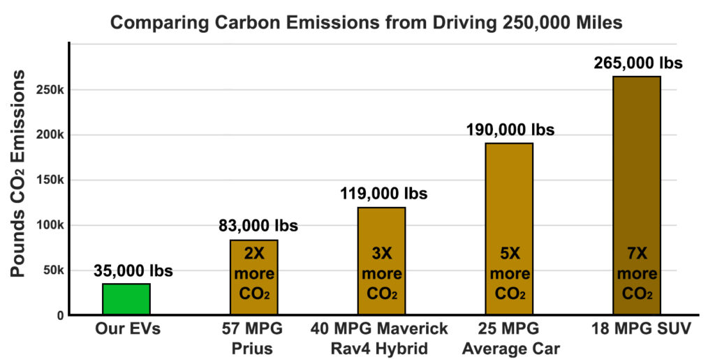 The fuel efficient 57 MPG Prius releases two times more CO2 into the atmosphere than our EV. The 40 MPG hybrid drivetrain versions of the Toyota Rav4 and Ford Maverick release 3X more and a large SUV releases 7X more CO2 into the atmosphere.