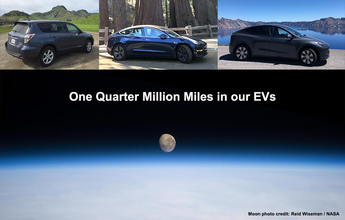 We got our first EV in 2013, and since 2018 we drive two EVs. This month we reached a quarter million miles driven in our EVs – that’s 250,000 electric miles over the past 12 years.