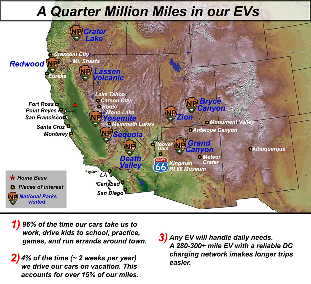 Our EVs take us to memorable places. Out of town trips included visits to National Parks, state parks, campgrounds along the California coast, cities, countless trips to the Bay Area, and other places of interest throughout California, Oregon, Nevada, Arizona, Utah, and New Mexico. We haven’t yet gone cross country in our EVs, but we get around a bit.