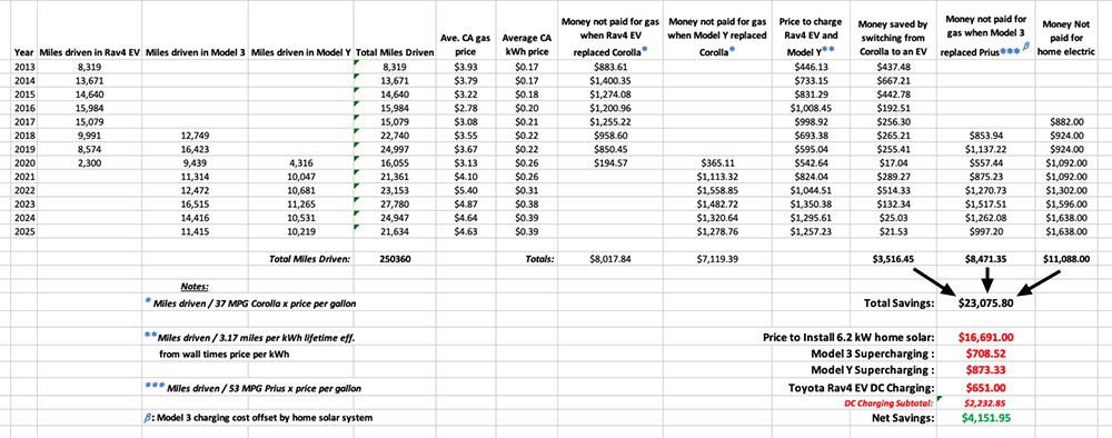 We saved money on fueling costs. The combination of switching to cheaper electricity to power our cars, and installing rooftop solar saved us money. We traded in a Toyota Corolla for the Rav4 EV in 2013, traded a Toyota Prius for the Model 3 in 2018, and replaced the Rav with a Model Y in 2020. Switching from 2 relatively efficient gas powered cars to much more efficient electric cars helped us save money primarily because you need less energy to move an electric car down the road.