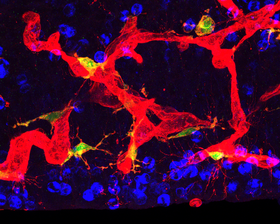 Actively dividing neural precursor cells (blue), blood vessels (red) and microglia (green) comprise the Neuro-Immune-Vascular plexus in prenatal mammalian proliferative zones.