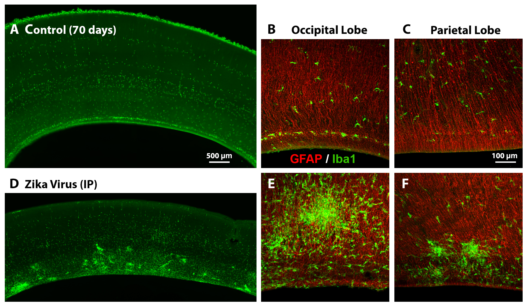 The distribution of microglial cells (green) is altered at 3 weeks after inoculation with Zika virus.